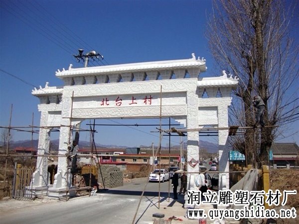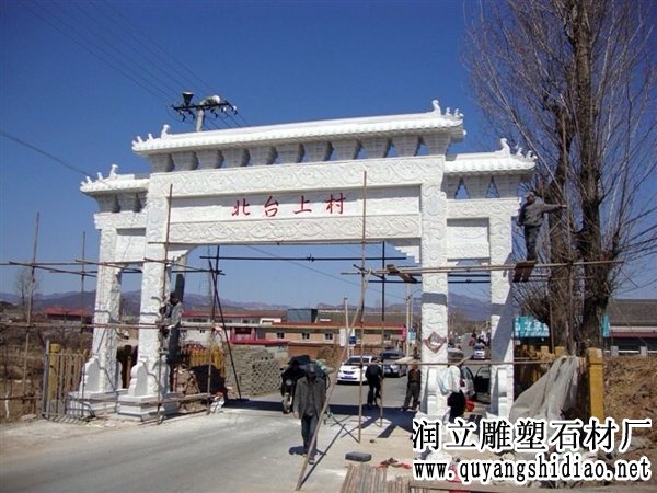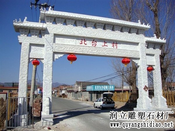 这件石牌楼是由河北省润立雕塑石材有限公司设计制作的,牌楼采用上等优质天然汉白玉材料经过工人30多天辛苦努力雕刻加工出来的一座三楼牌坊,这座石牌楼安装在山东省山东省山东省烟台市招远市辛庄镇北台上村口,经过工人10多天安装完毕,这件石牌楼长12.8米,高9.8米最后其协调的比例,上等的材料制作出来的石牌楼得到了当地老百姓的高度评价,同时也受到了当地市领导的赞评,说为他们村完成了一件万年大计工程。