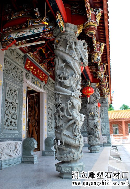 这是坐落于寺庙大门前的花岗岩龙盘柱,龙柱采用我公司最有技术的师傅专业雕刻而成,历时50多个日夜,加班为寺庙制作了优秀的龙珠作品,龙柱采用上等材料加工,一对祥龙相互忽悠,为寺庙带来更威武的气势,这件龙盘柱雕塑深受到寺庙师傅的高度认可,也为我公司带来了更好的信誉,同时欢迎各界朋友有需要此类雕塑的联系我们:http://www.quyangshidiao.net/sz/